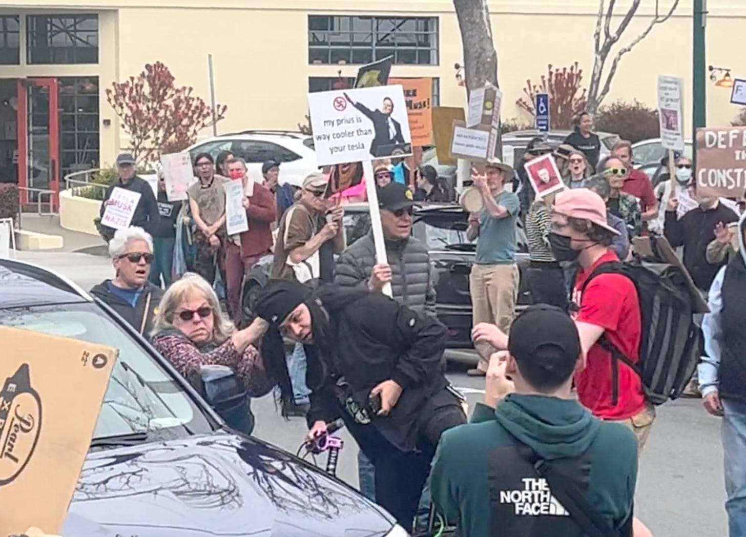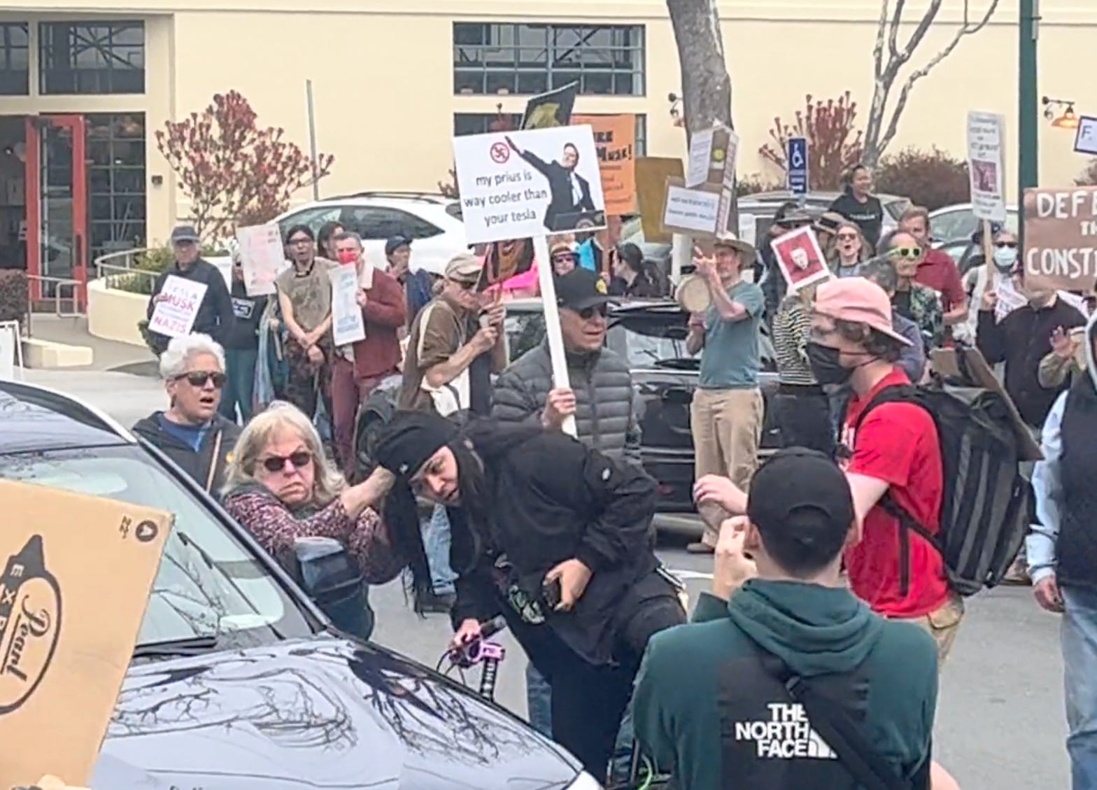 As for that MAGA head case, I’ve been following him in our local press. Turns out he already had a long history of provocation and violence. And then, on April 13, Berkeley police responded to a domestic-violence call — only to have Ruiz/Occult/Fuze come out and threaten them with a shotgun. So they shot him instead (not fatally), and arrested him. Ruiz now faces 17 felony charges from that incident, as well as misdemeanor charges for his stun-gun escapades on March 22, when Susan Kegeles truly put the “takedown” in #TeslaTakedown.